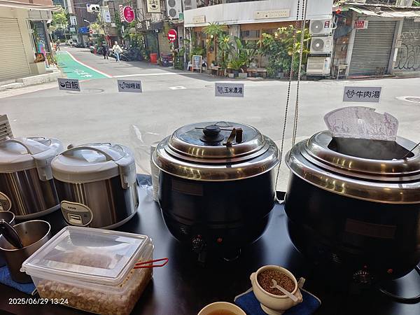 這裡的附餐是自助式,牛肉湯、玉米濃湯,還有咖哩和白飯(但我們沒有拿主食,主餐已經有鐵板麵了)。