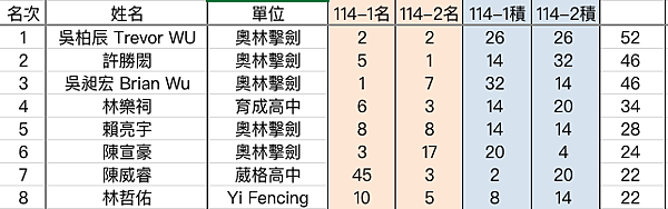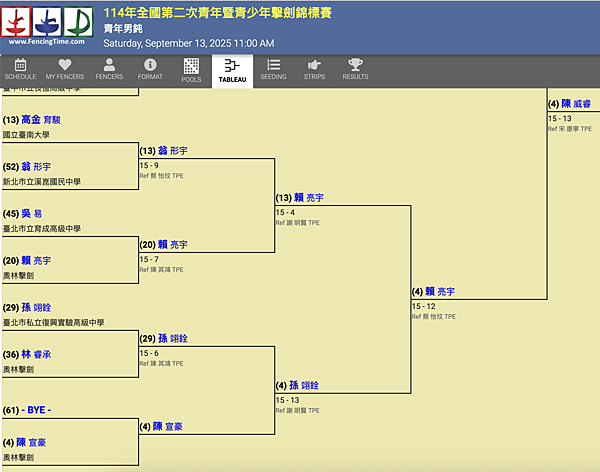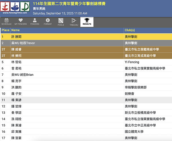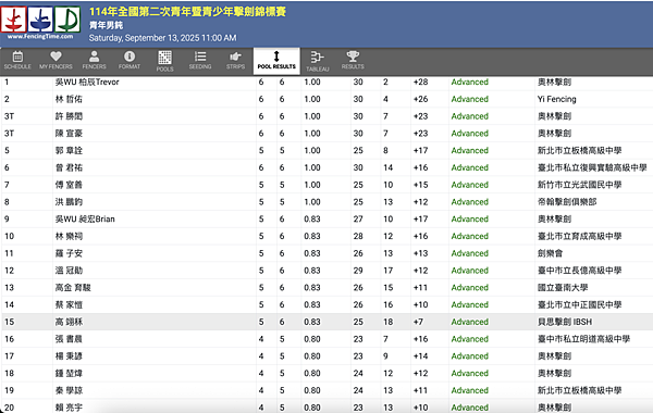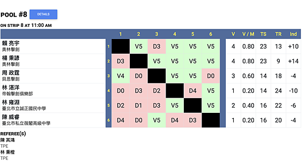 因為先前青排成績也不錯(我不好意思用打得不錯,順利完成全中運團賽積分任務-114年全國第一次青年暨青少年擊劍錦標賽),所以,這次比賽種子排序第8(青排是第10,上次青排是17),小組賽分在第8組,但意外輸了一場,5分的比賽有時還沒反應過來就結束了。上次初賽排名還有18,這次更低,來到20。
